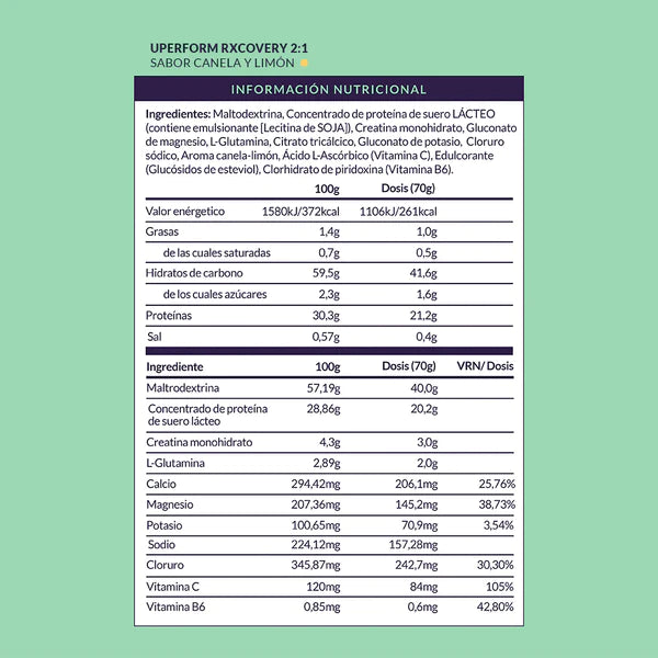 RxCOVERY 2:1 combina una fuente de hidratos de carbono de alta carga glucémica, proteína concentrada de suero lácteo con un alto valor biológico y gran digestibilidad, junto con una dosis efectiva de monohidrato de creatina y un pool de los principales electrolitos involucrados en la recuperación tras el ejercicio.