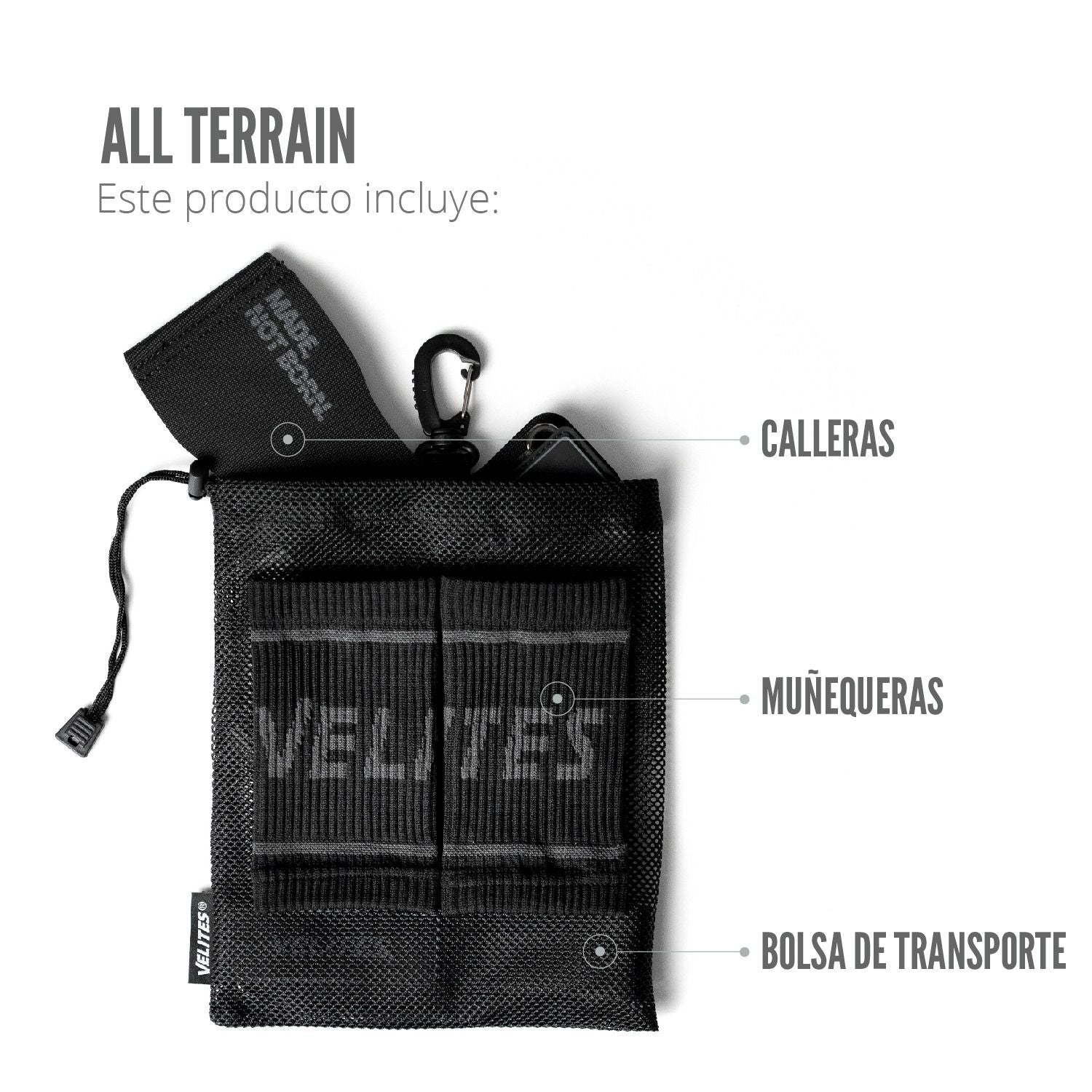 Este producto incluye: Calleras ALL TERRAIN, Muñequeras y bolsa de transporte antiolor.